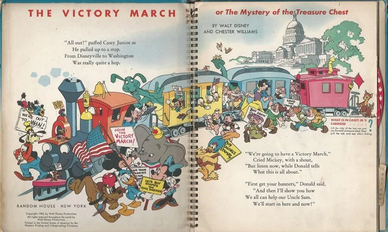 Disney partnered with several other government programs to educate citizens and encourage them to do their part for the war effort. Disney characters appeared on posters, in books, and even on war bonds to boost their appeal to children. Examples from the museum’s collection include a series of posters made for the Food and Nutrition Committee of the California War Council, as well as a book with movable characters created at the “suggestion” of the U.S. Treasury Department. Disney designed the book The Victory March to teach children the importance of saving stamps for war bonds.